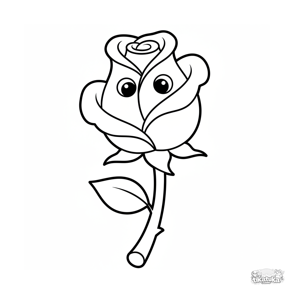 Sehr einfaches Ausmalbild für Kleinkinder 2-3: Eine große Rosenknospe mit einem Blatt am Stiel. Riesige Ränder, dicke Umrisse.