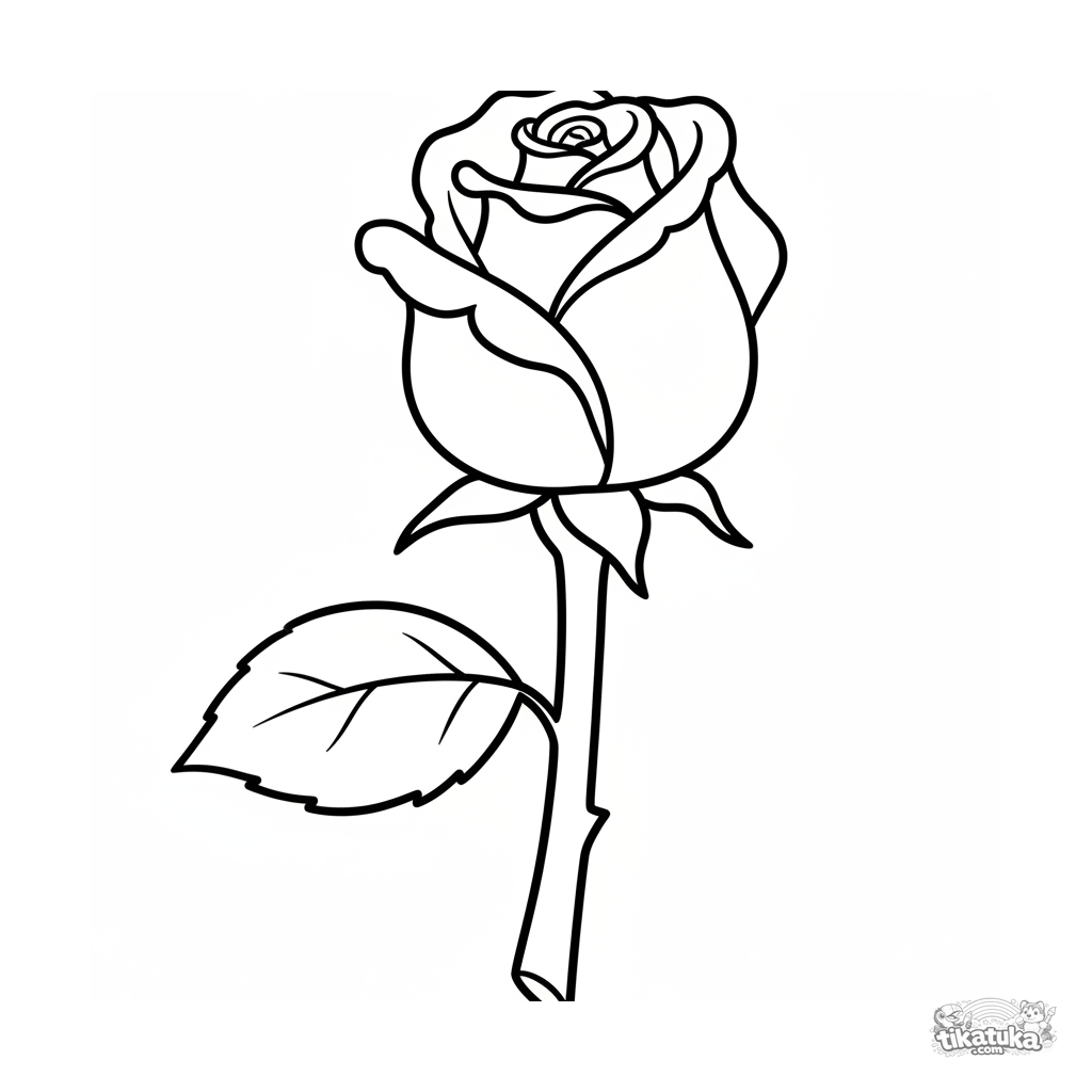 Sehr einfaches Ausmalbild für Kleinkinder 2-3: Eine große Rosenknospe an einem Stiel mit einem Blatt.