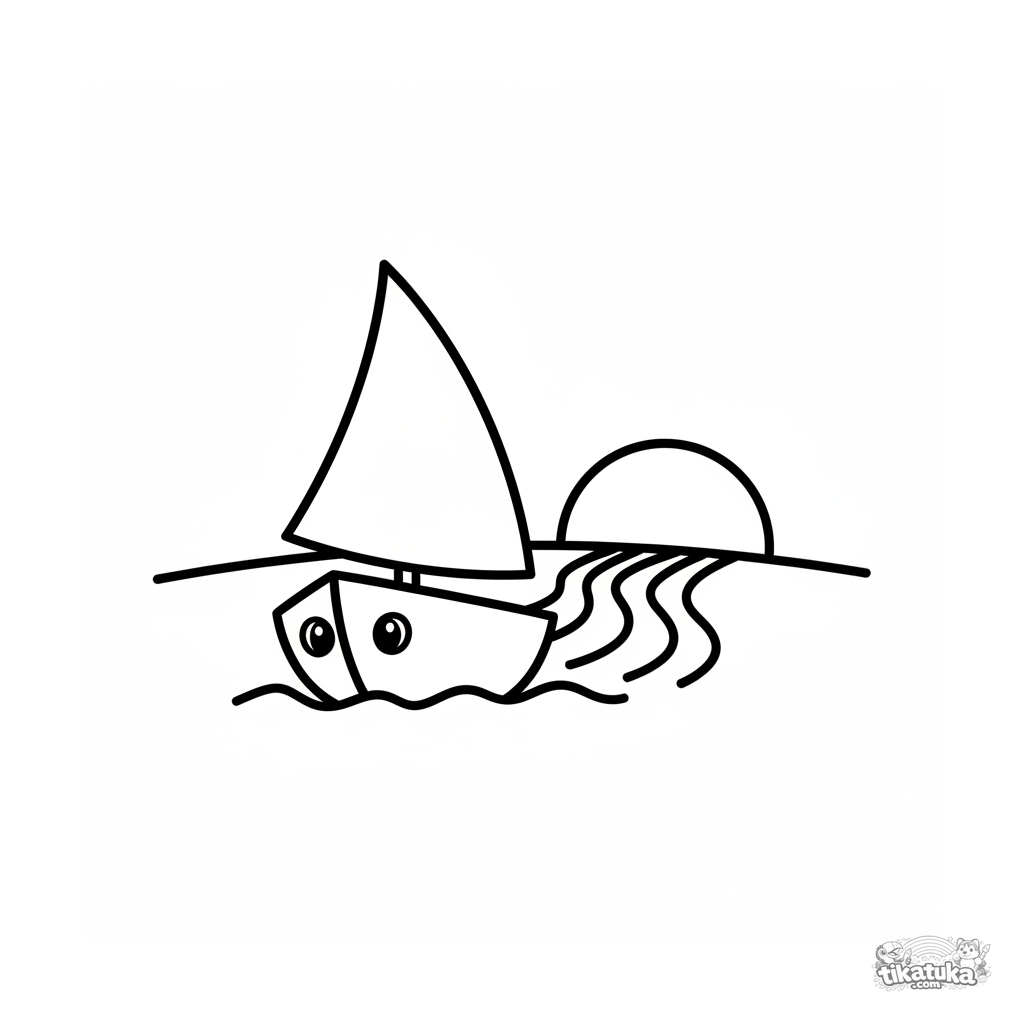 Ausmalbild für Kleinkinder: Ein einfaches Segelboot mit dreieckigem Segel fährt auf einem ruhigen Meer vor einem Sonnenuntergang.