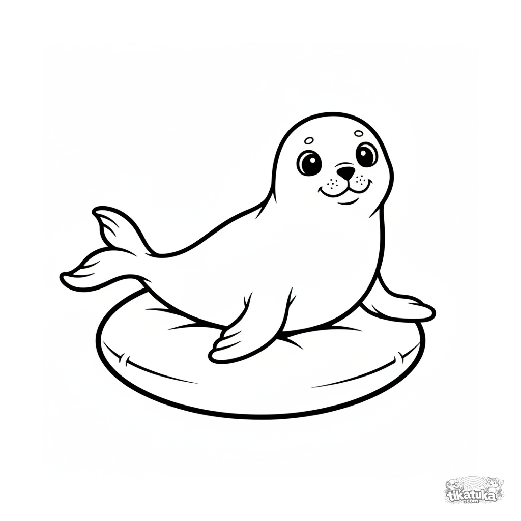 Ausmalbild für Kleinkinder: eine einfache Robbe mit großen Augen ruht auf dem Bauch auf einem weichen Kissen. Glatte Konturen.