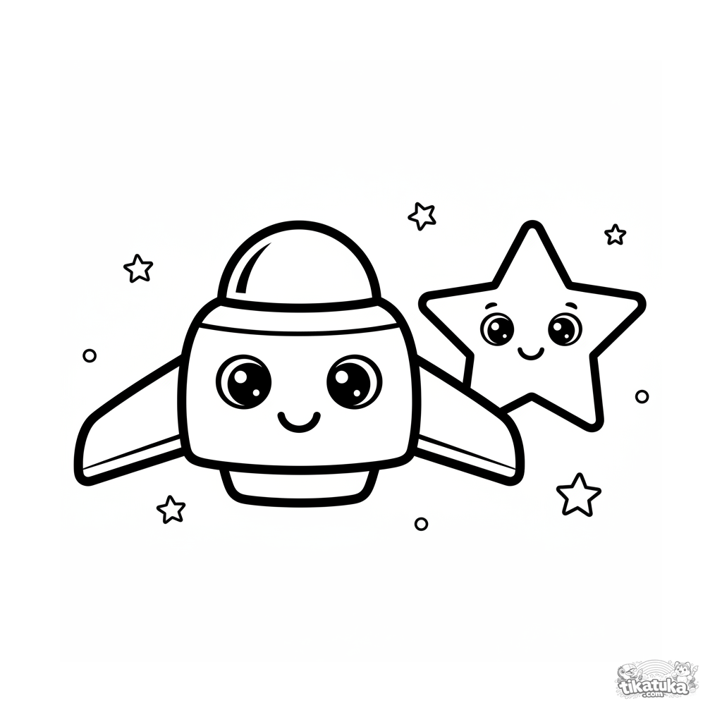 Ausmalbild für Kleinkinder 2-3 Jahre: Ein einfaches freundliches Raumschiff mit einem Lächeln und einem großen Stern im Weltraum. Riesige weiße Ränder, klare Umrisse.