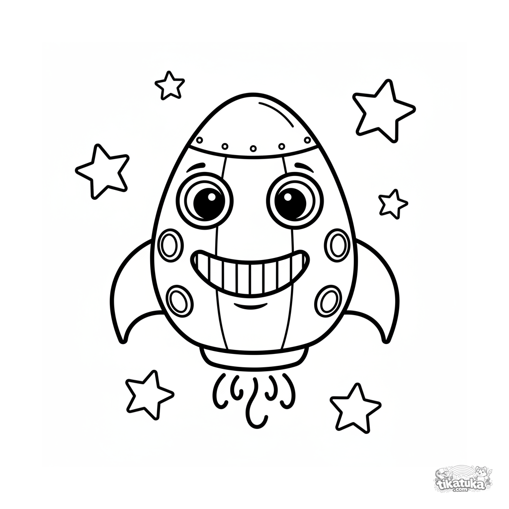 Ultra-einfaches Ausmalbild für Kleinkinder 2-3: Ein lächelndes Raumschiff schwebt zwischen Sternen. Sehr dicke Umrisse, eine große Form, überhaupt keine winzigen Details.