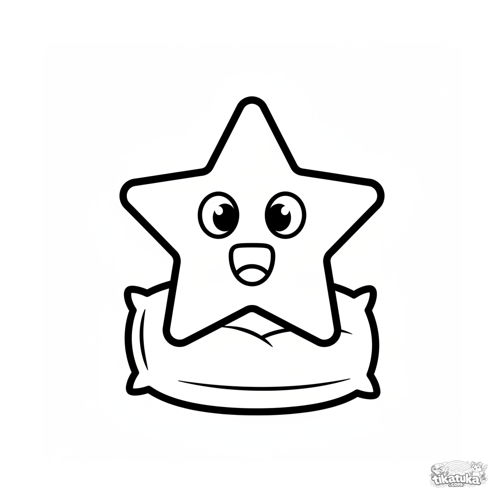Ausmalbild für die Allerkleinsten: ein überraschter Stern mit einem Lächeln ruht auf einem Kissen. Klare geometrische Form, glatte Konturen.