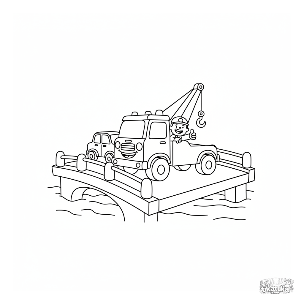 Einfaches Ausmalbild für Kleinkinder 2-3: Ein freundlicher Abschleppwagen hilft einem Auto auf einer Brücke über einem Fluss. Große Formen, klare Umrisse.