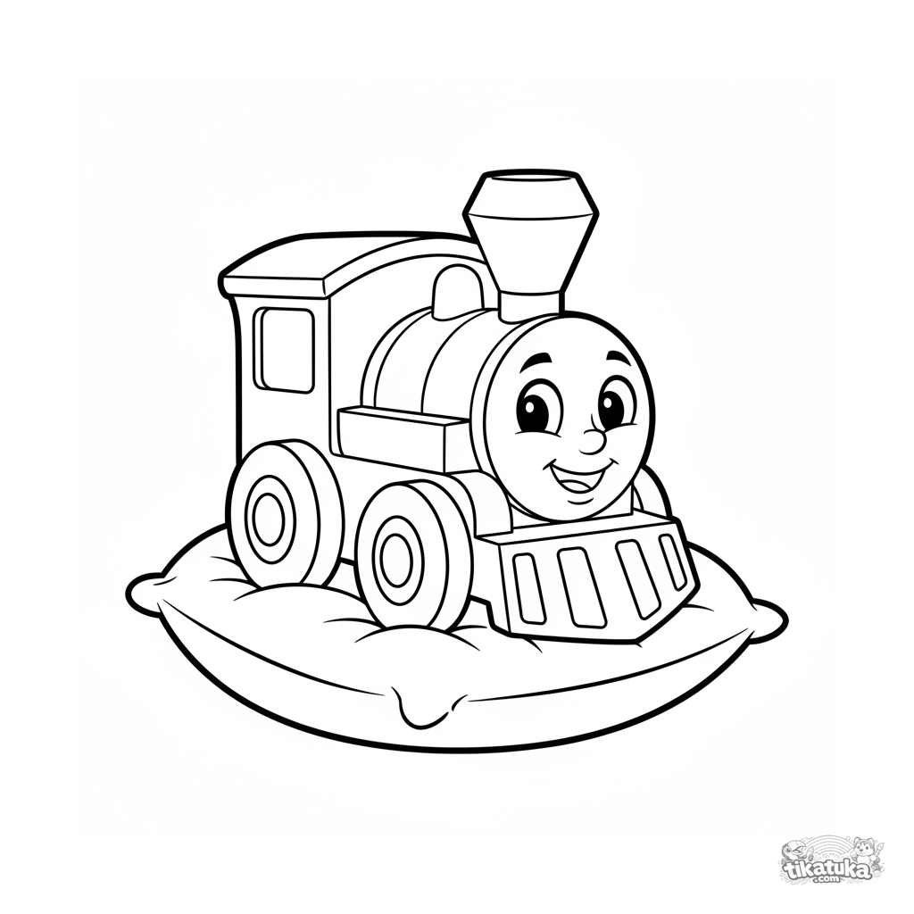 Ausmalbild für 2-3 Jahre: eine einfache Spielzeug-Lokomotive sitzt auf einem Kissen. Große Teile, klarer Umriss, fast kein Hintergrund.