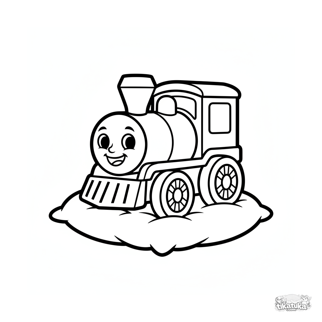 Ausmalbild für 2-3 Jahre: eine einfache, lächelnde Lokomotive sitzt auf einem weichen Kissen. Große Teile, klare Umrisse, perfekt für erste Malaktivitäten.