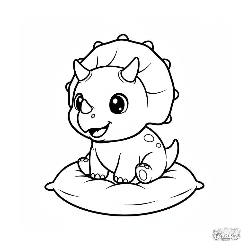 Ausmalbild für Kleinkinder: ein freundlicher Triceratops mit großen Augen sitzt auf einem weichen Kissen. Große, klare Formen.