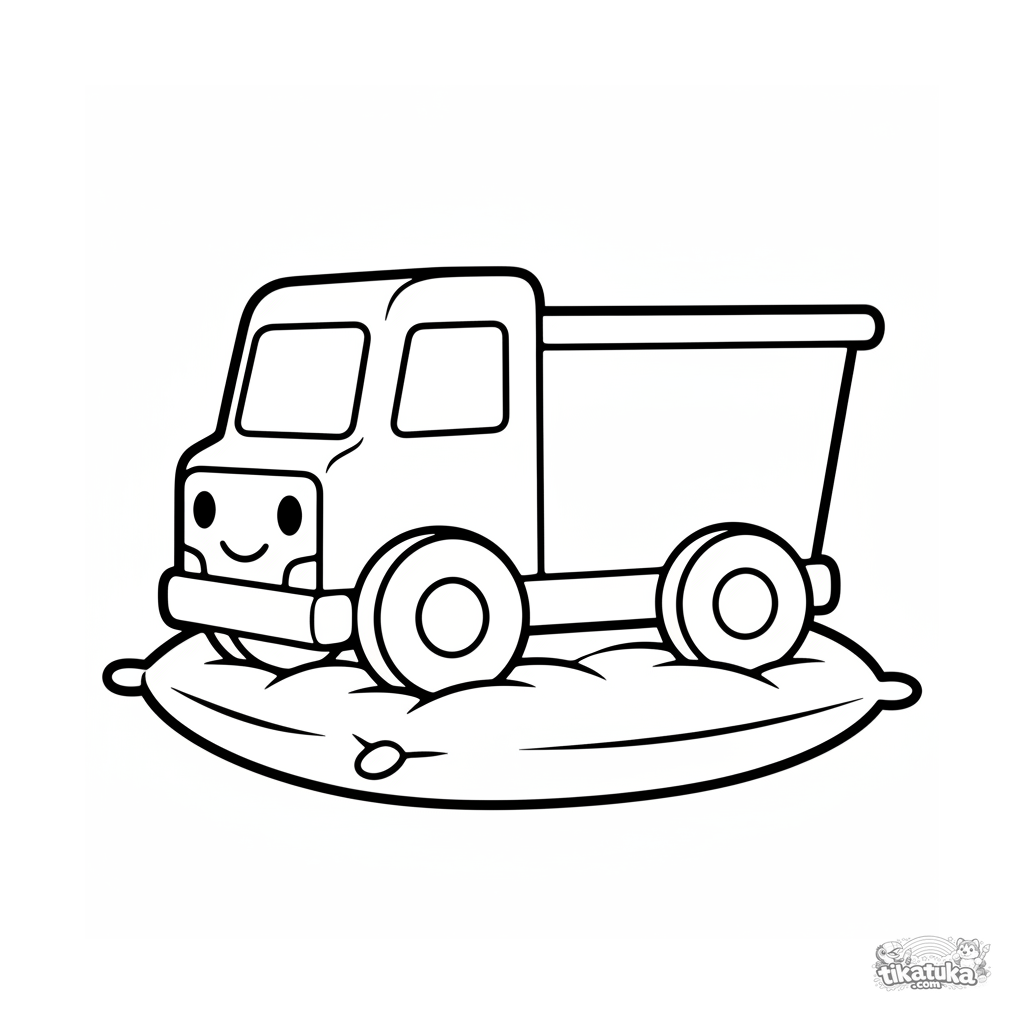 Ausmalbild für Jungen und Mädchen 2-3 Jahre: ein einfacher Spielzeug-LKW mit Lächeln auf einem Kissen. Große geometrische Formen.