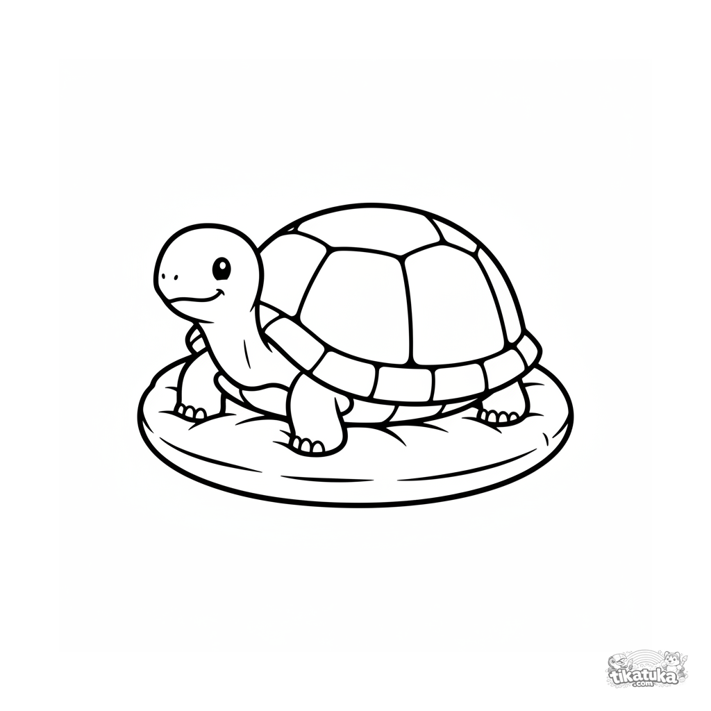 Klares und verständliches Ausmalbild für Kleinkinder 2-3 Jahre: eine Schildkröte mit großem Panzer sitzt auf einem Kissen. Einfache Formen, dicker Umriss, minimale Details.
