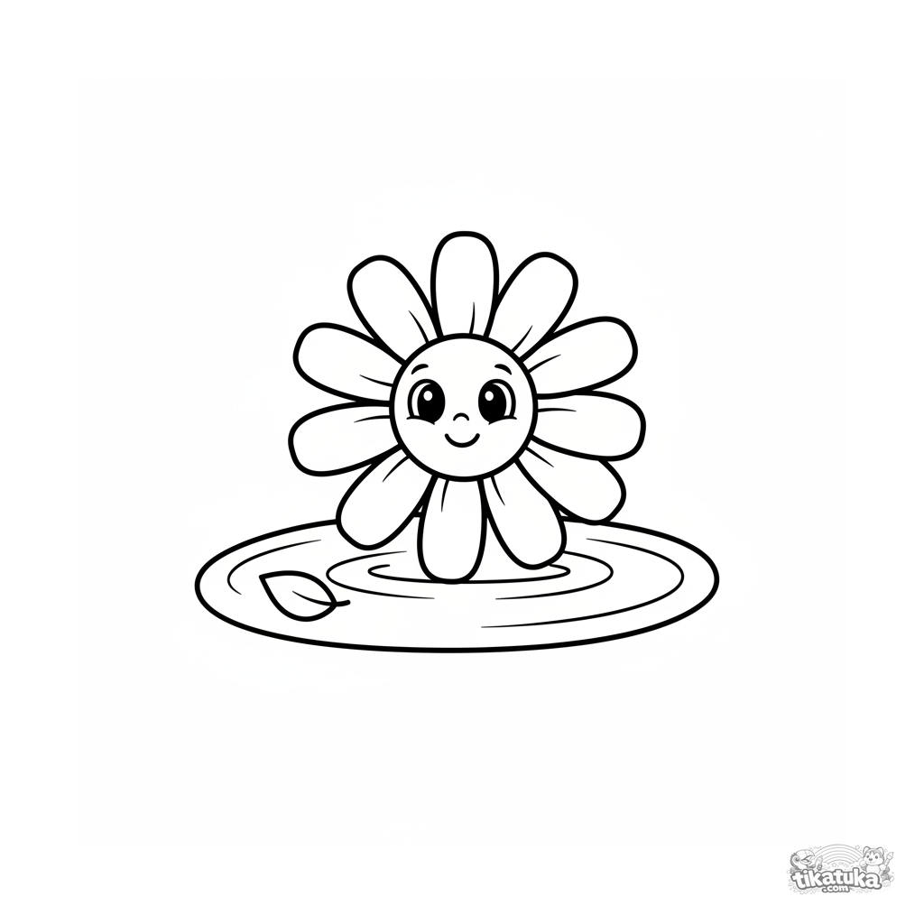 Ein einfaches Ausmalbild für Kleinkinder von 2-3 Jahren: ein Gänseblümchen schwimmt in einer runden Regenpfütze. Große, klare Formen und breite Ränder für erste Malerfahrungen.