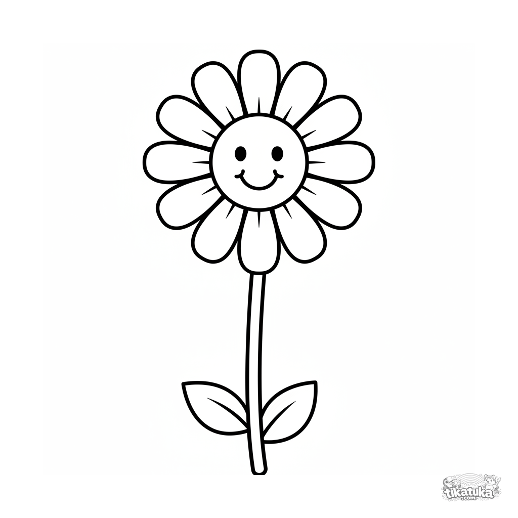 Sehr einfaches Ausmalbild für Kleinkinder 2-3: Eine große Gänseblümchen auf einem langen Stiel. Einfachste Formen, riesige weiße Ränder.