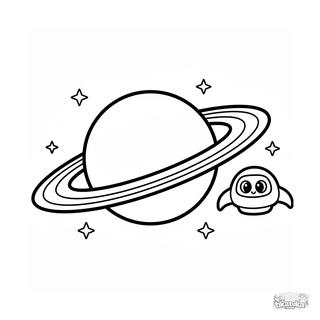 Einfaches Ausmalbild für Kleinkinder 2-3: Ein großer Ringplanet und ein winziges Raumschiff zwischen Sternen. Große, klare Formen, viel Freiraum.