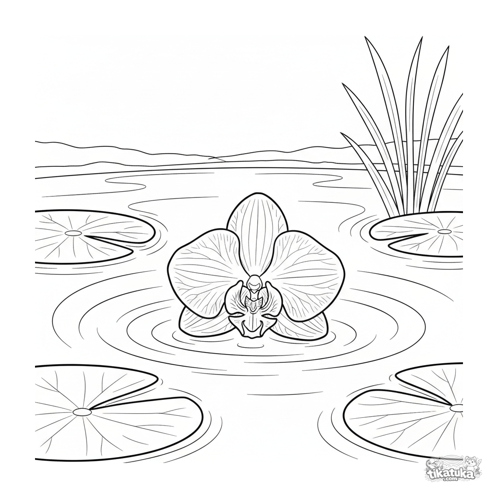 Ausmalbild für 7-9 Jahre: Eine zarte Orchidee mit gemusterten Blütenblättern schwimmt auf der Oberfläche eines Gartenteichs zwischen Seerosen und Wellen.