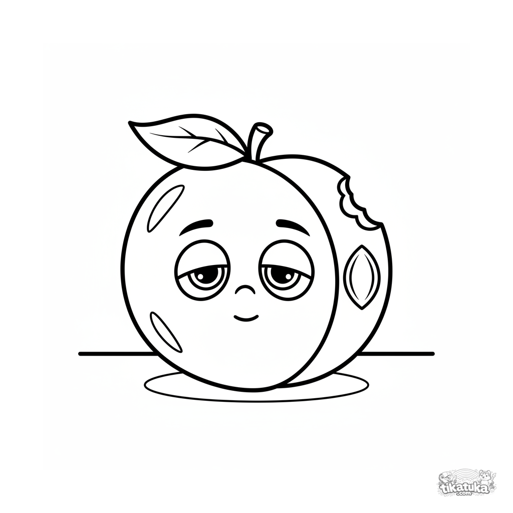 Sehr einfaches Ausmalbild für Kleinkinder 2-3: Ein großer Pfirsich mit einem Blatt. Weiche runde Formen, Andeutung von Textur, klare Silhouette.