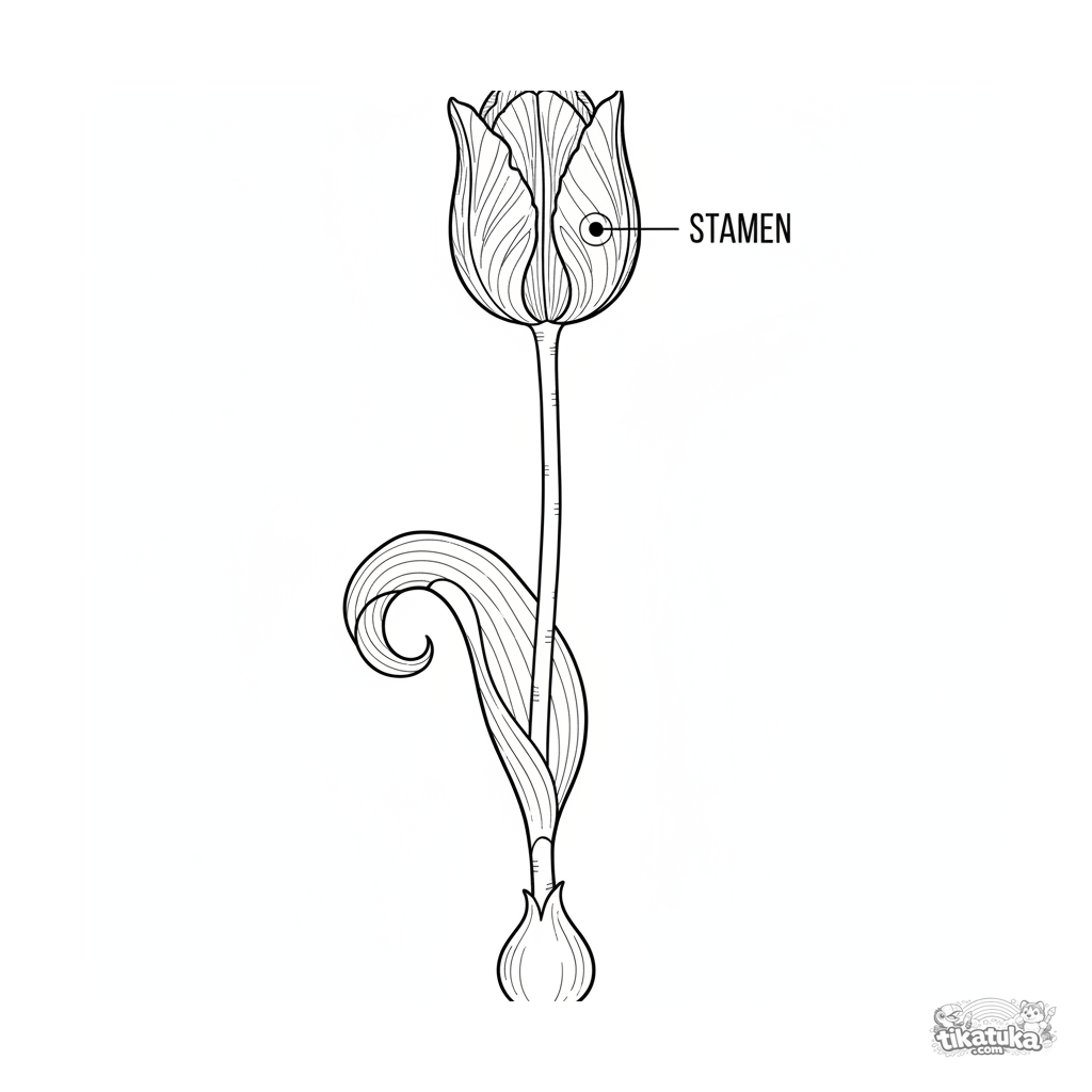 Botanisches Tulpen-Ausmalbild für Kinder von 7-9 Jahren. Detaillierte Blütenblätter, Stängel, Blatt und ein kleines Label. Sauberer Hintergrund.