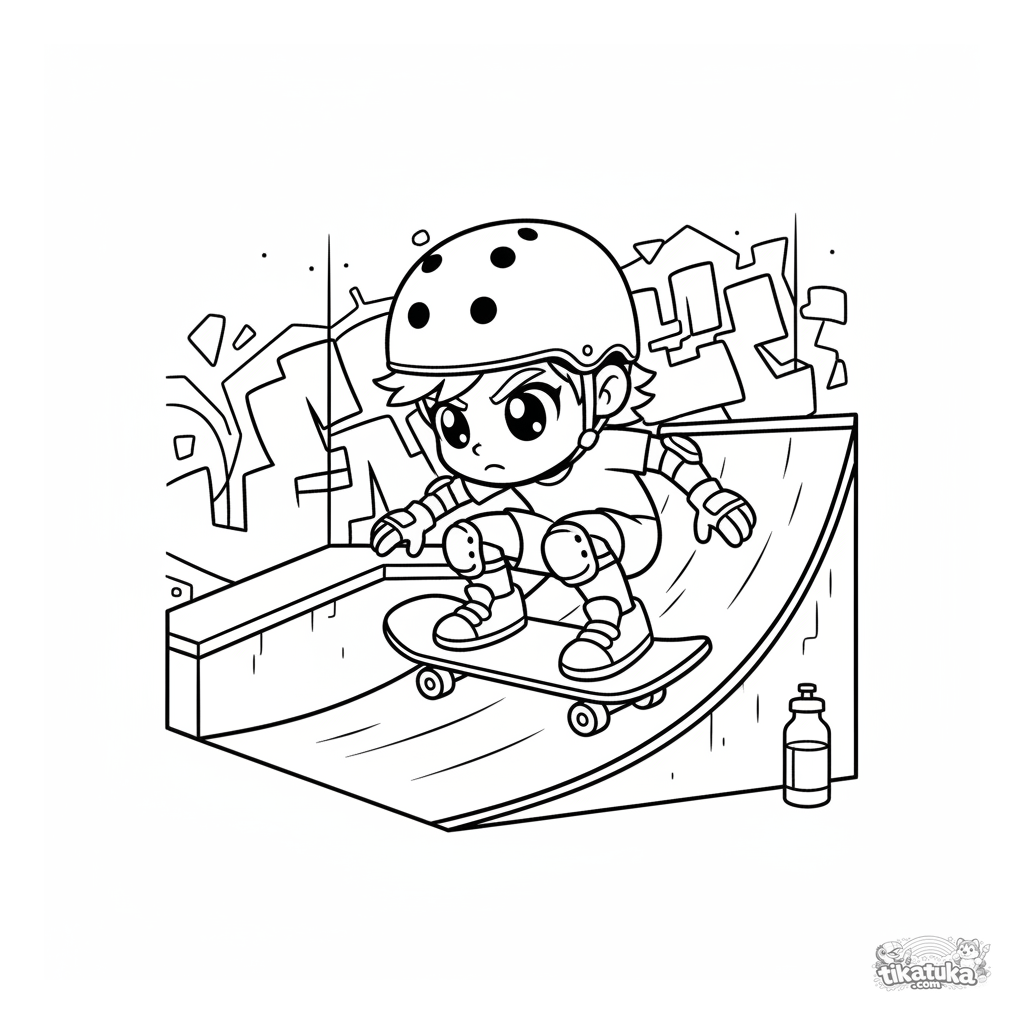 Ausmalbild für ältere Kinder: Ein Skateboardfahrer fährt eine Rampe im Skatepark hinunter. Geeignet für 7-12 Jahre, mit detailliertem Hintergrund.
