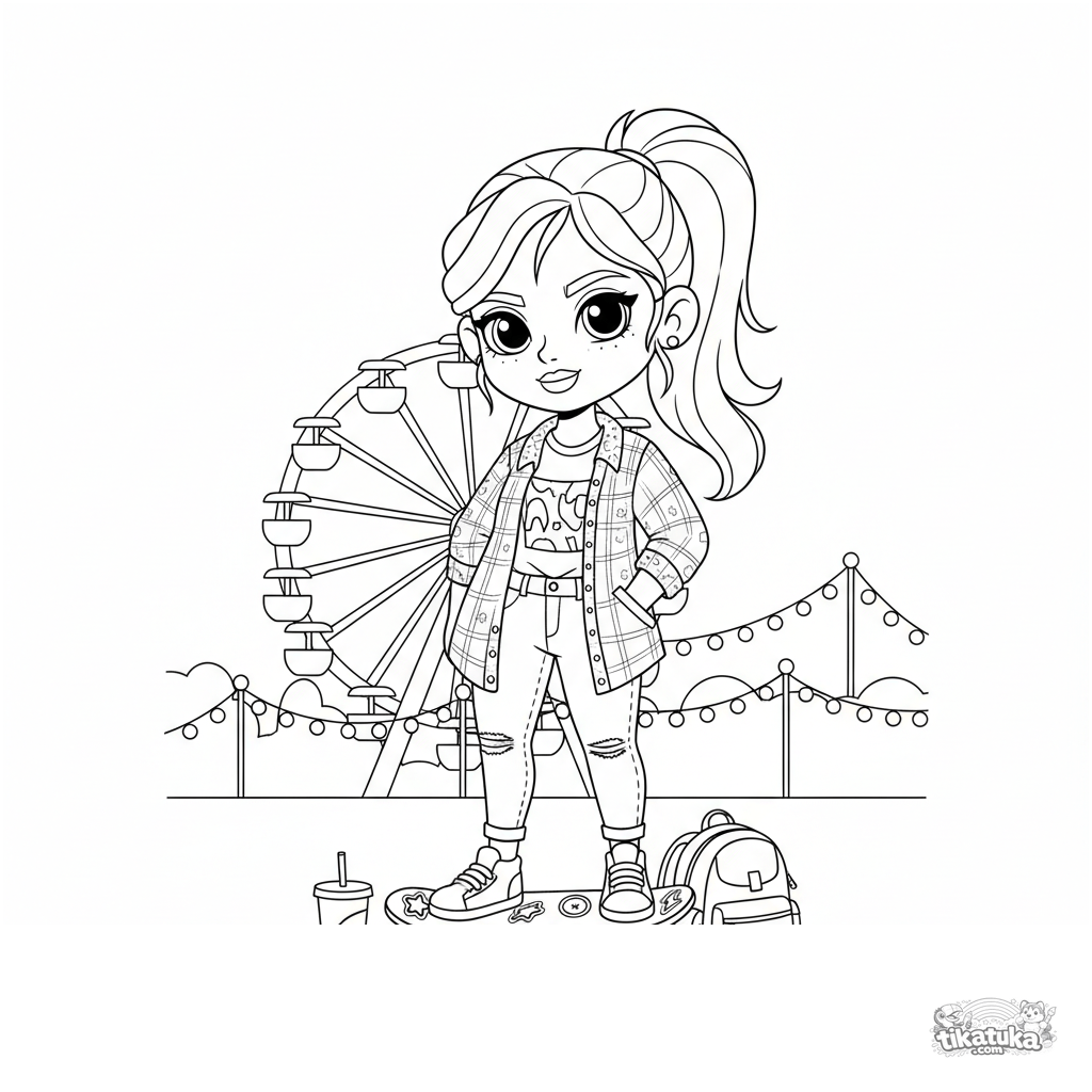 Ausmalbild für Kinder von 7-12 Jahren: Eine Skaterin posiert mit ihrem beklebten Board auf einem lebendigen Nachtmarkt. Detaillierte Szene mit Riesenrad, Lichterkette und Rucksack.