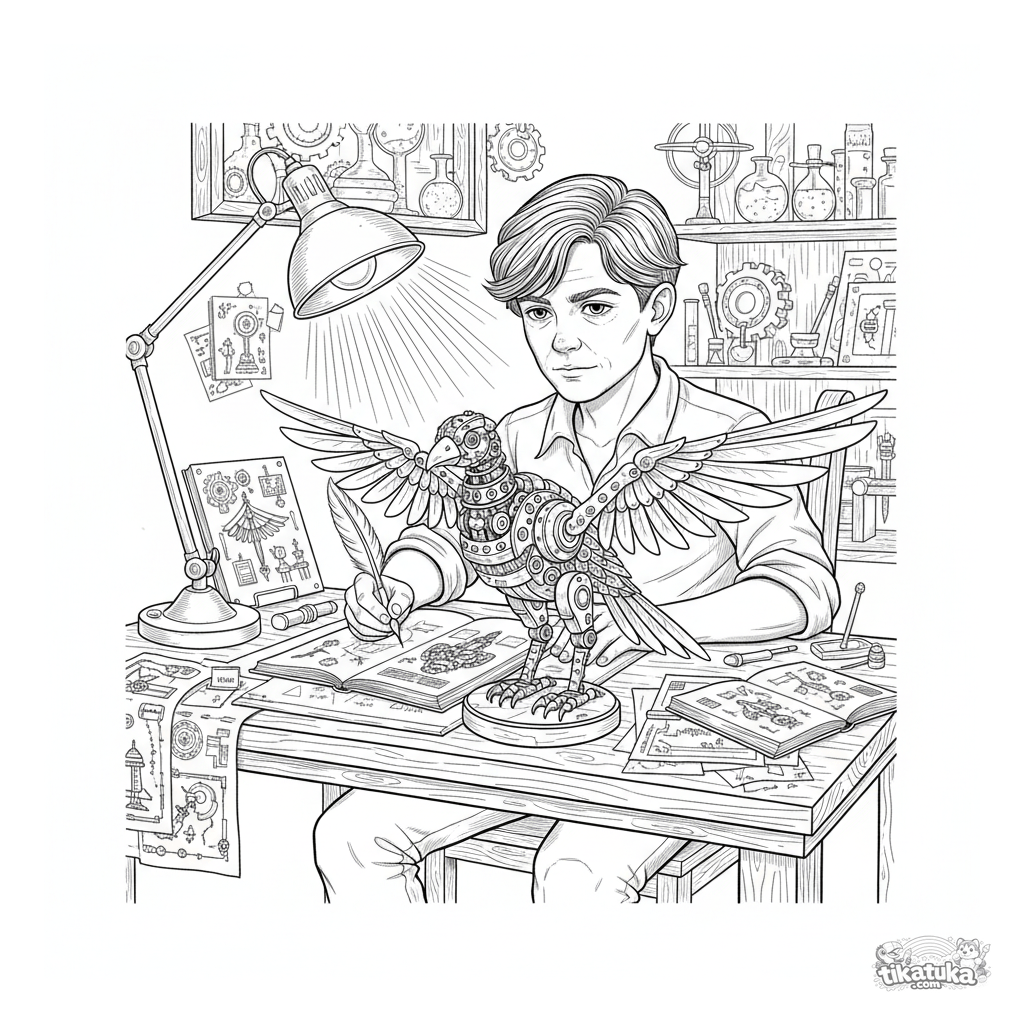 Komplexes Ausmalbild für Kinder 10-12: Ein Erfinder in einem geheimen Labor skizziert ein detailliertes Design eines komplizierten mechanischen Vogels an seinem Zeichentisch.