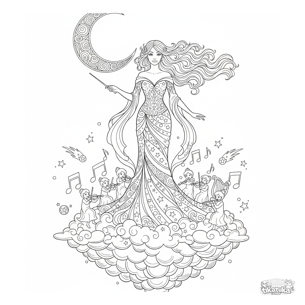 Detailliertes Ausmalbild für Mädchen 10-12 Jahre: Eine Himmels-Prinzessin dirigiert ein Orchester aus Sternenlichternoten auf einer schwebenden Wolken-Terrasse.
