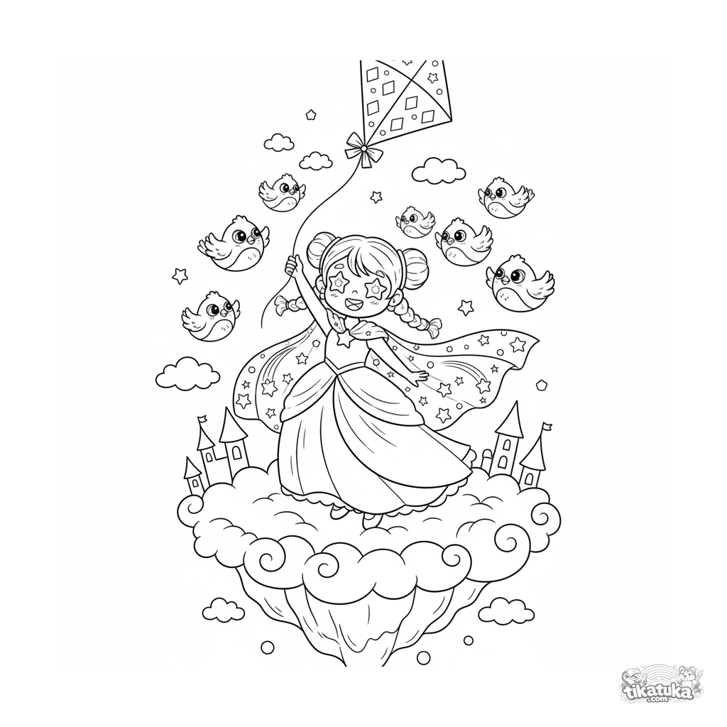 Ausmalbild für 4-6 Jahre: Eine Himmelsprinzessin in einem sternenbesetzten Umhang lässt einen Drachen von einer flauschigen Wolken-Terrasse steigen, kleine Vögel kreisen um sie.