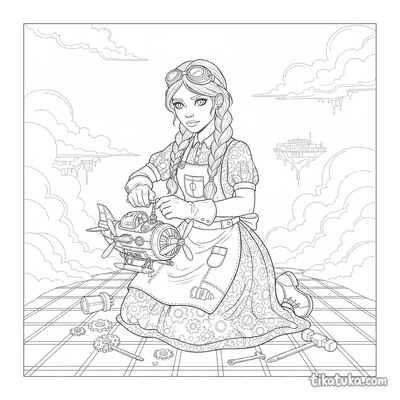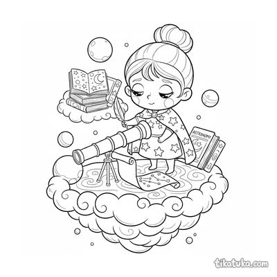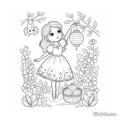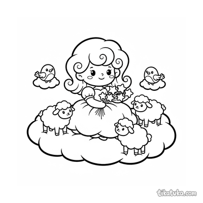 Ausmalbild für Kinder 4-6: Eine Himmelsprinzessin in einem sternenbesetzten Umhang führt eine festliche Parade schwebender Papierlaternen entlang eines Wolkenpfades im Wolkenkönigreich an.