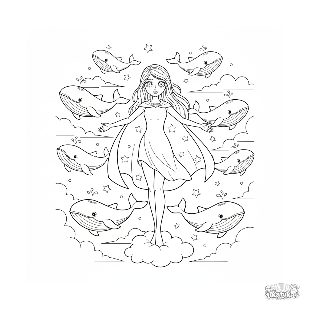 Ausmalbild für 7-9: Eine Himmelsprinzessin führt eine Parade fliegender Wale über den Sternenhimmel. Eine magische und freundliche Szene.