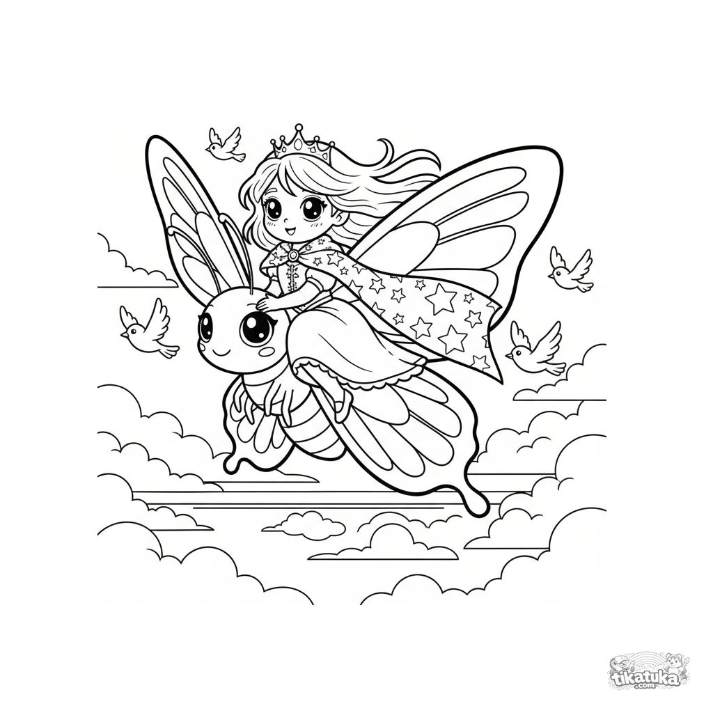 Ausmalbild für Kinder 7-9: Eine Himmelsprinzessin reitet auf einem Riesen-Schmetterling über eine Wolken-Terrasse. Dynamische Pose, fließendes Haar und Umhang.