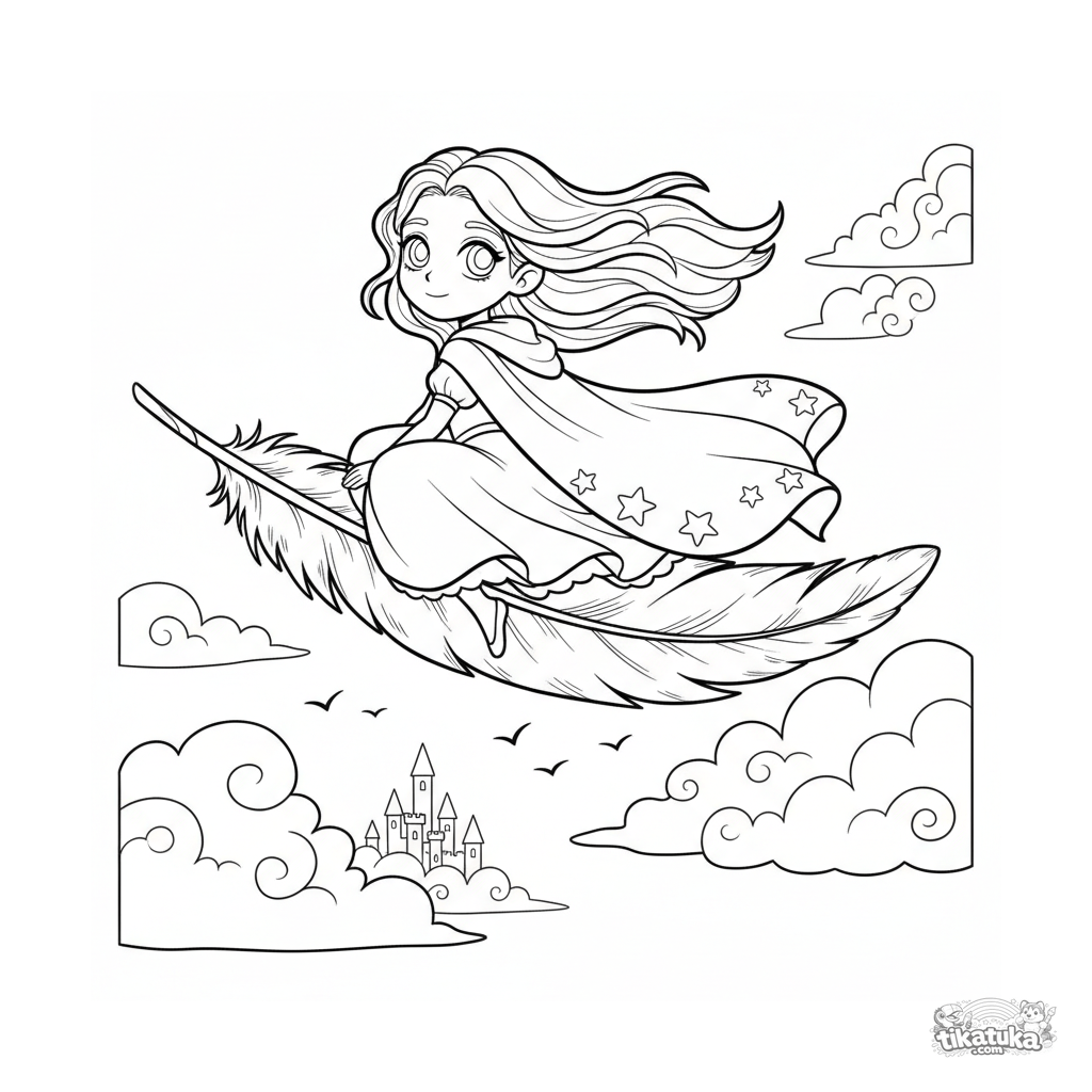 Ausmalbild für 7-9 Jahre: Eine Himmels-Prinzessin in einer wehenden Kapte reitet auf einer riesigen Feder über ein Wolkenkönigreich, mit einer entfernten Wolkenburg im Hintergrund.