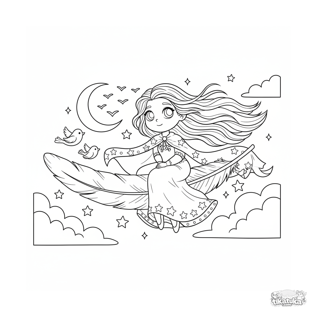 Ausmalbild für ältere Kinder 10-12: Eine Himmelsprinzessin reitet auf einer Riesen-Feder über sternenklare Wolken. Detaillierte, magische Szene.
