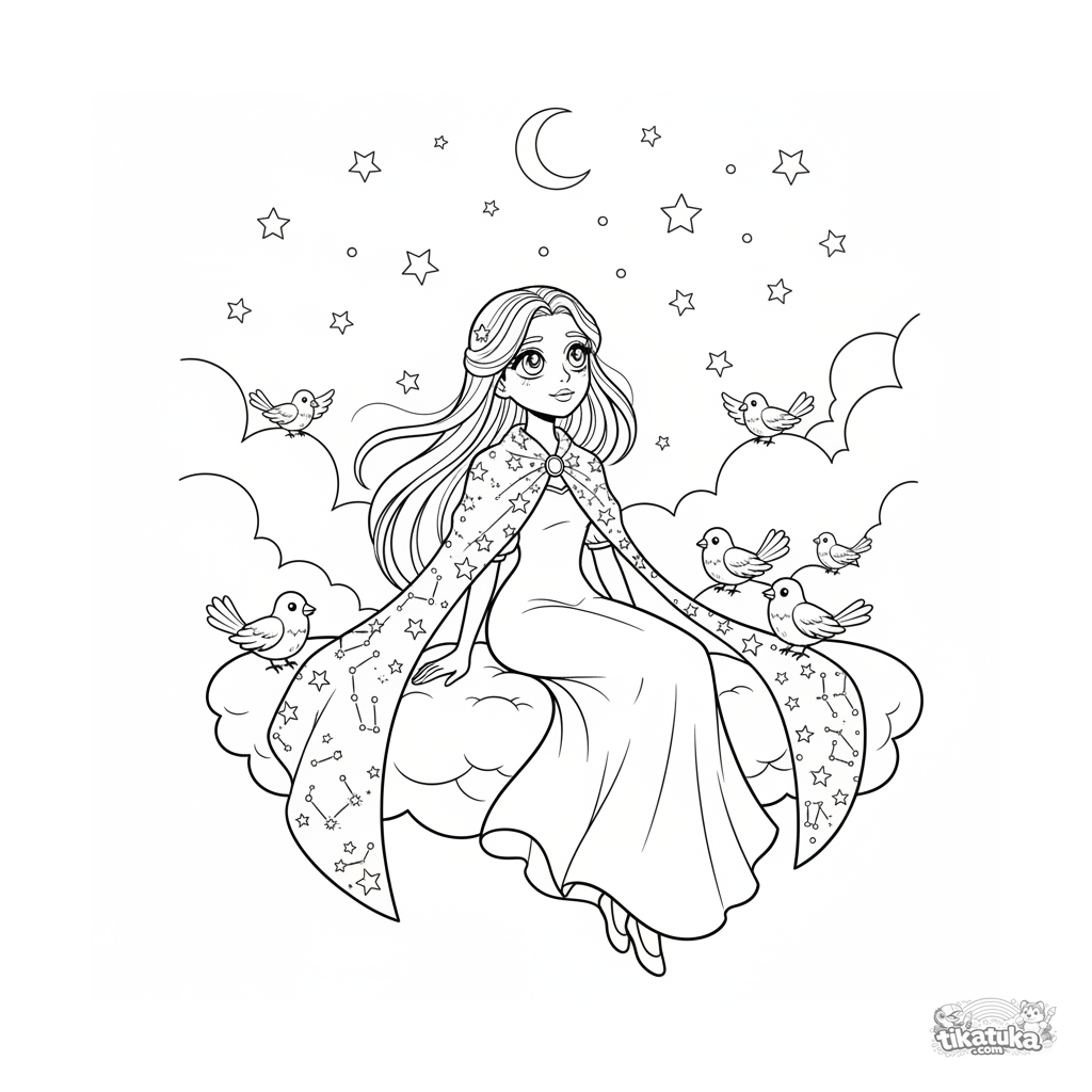 Ausmalbild für Kinder 7-9: Eine Himmelsprinzessin beobachtet Sterne von ihrer Wolkenterrasse aus.