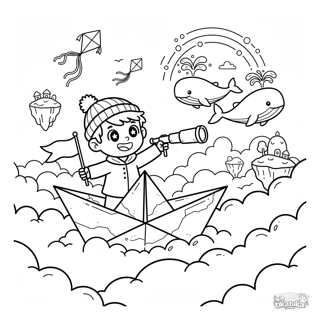 Ausmalbild für Kinder: Ein mutiger Himmels-Seemann segelt mit einem Papierboot auf einem Wolkenmeer und winkt Walen zu. Eine abenteuerliche Szene aus Mythen.