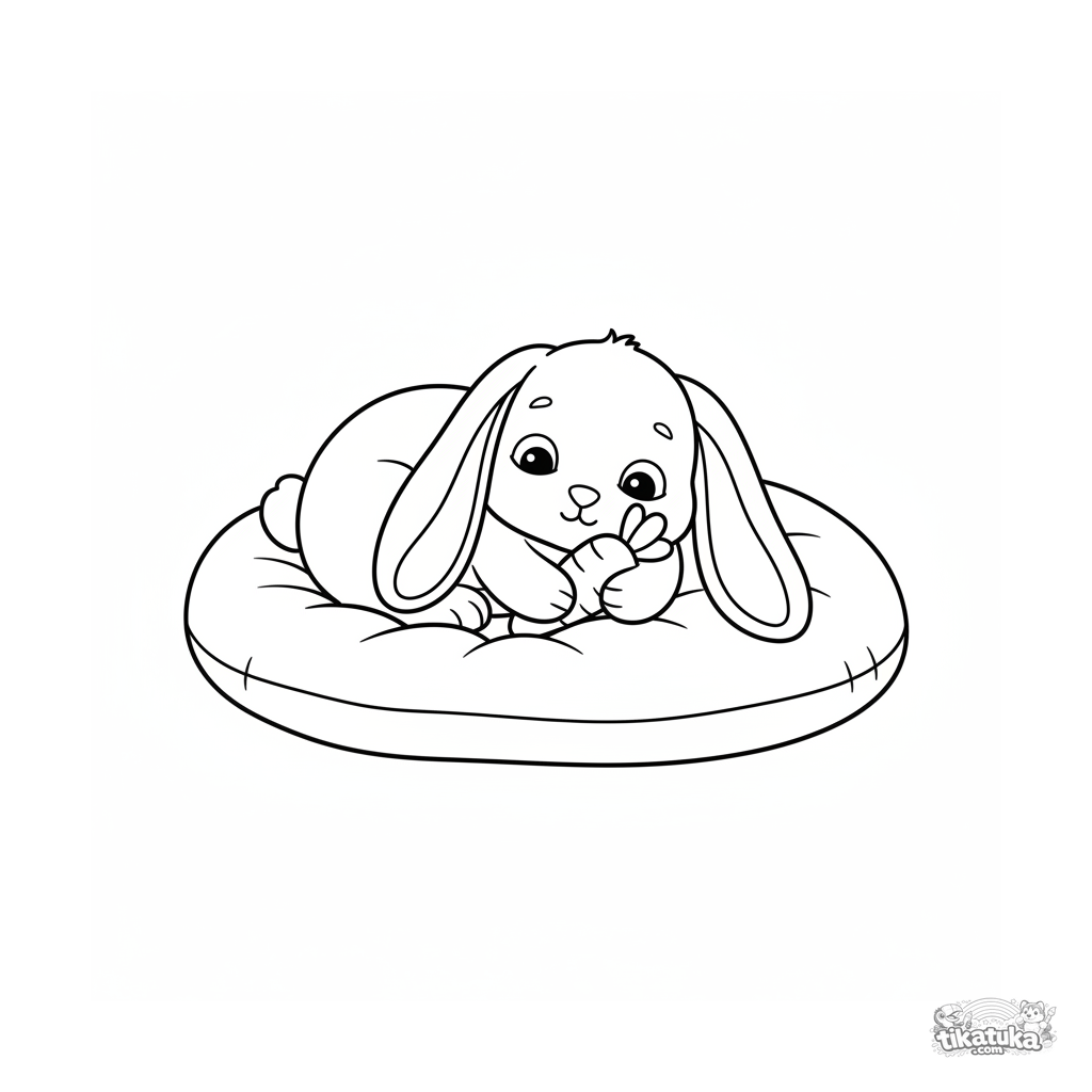 Ausmalbild für die Allerkleinsten: ein schlafendes Plüschhäschen mit einer Karotte liegt auf einem Kissen. Einfache klare Umrisse, große Formen, breite Ränder.