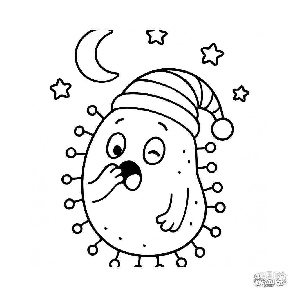 Ausmalbild für Kinder 3-6 Jahre. Niedliche pummeliges Bakterium mit Schlafmütze gähnt unter Mond und Sternen. Spielerische Einführung in Mikroben. Kostenlos herunterladen.
