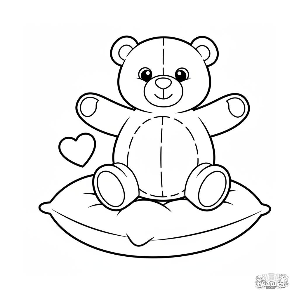Malmalbild für Kleinkinder 2-3 Jahre: ein schläfriger Plüschteddy sitzt auf einem weichen Kissen. Einfache große Formen, wenige Details, breite weiße Ränder zum Ausmalen.