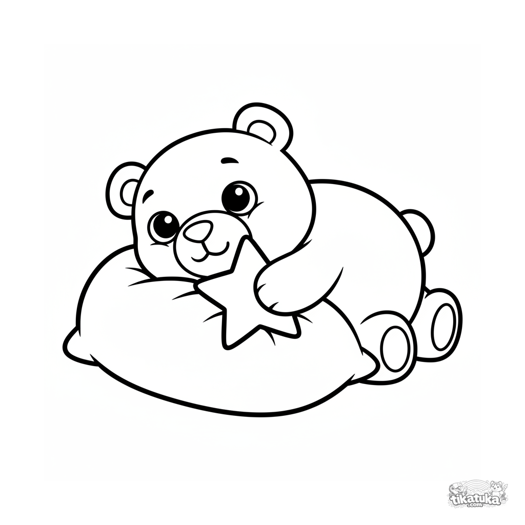 Ausmalbild für Kleinkinder 2-3 Jahre: ein schläfriger Plüschbär liegt auf einem weichen Kissen. Einfache große Formen, wenige Details, perfekt für erste Buntstifte.