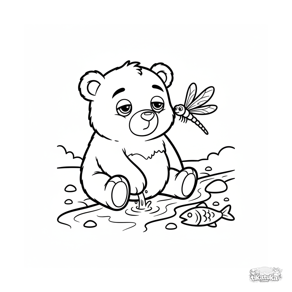 Einfaches Ausmalbild für Kleinkinder 2-3: Ein schläfriges Bärenjunges sitzt an einem Bach. Große einfache Formen, wenige Details, perfekt für erste Buntstifte.