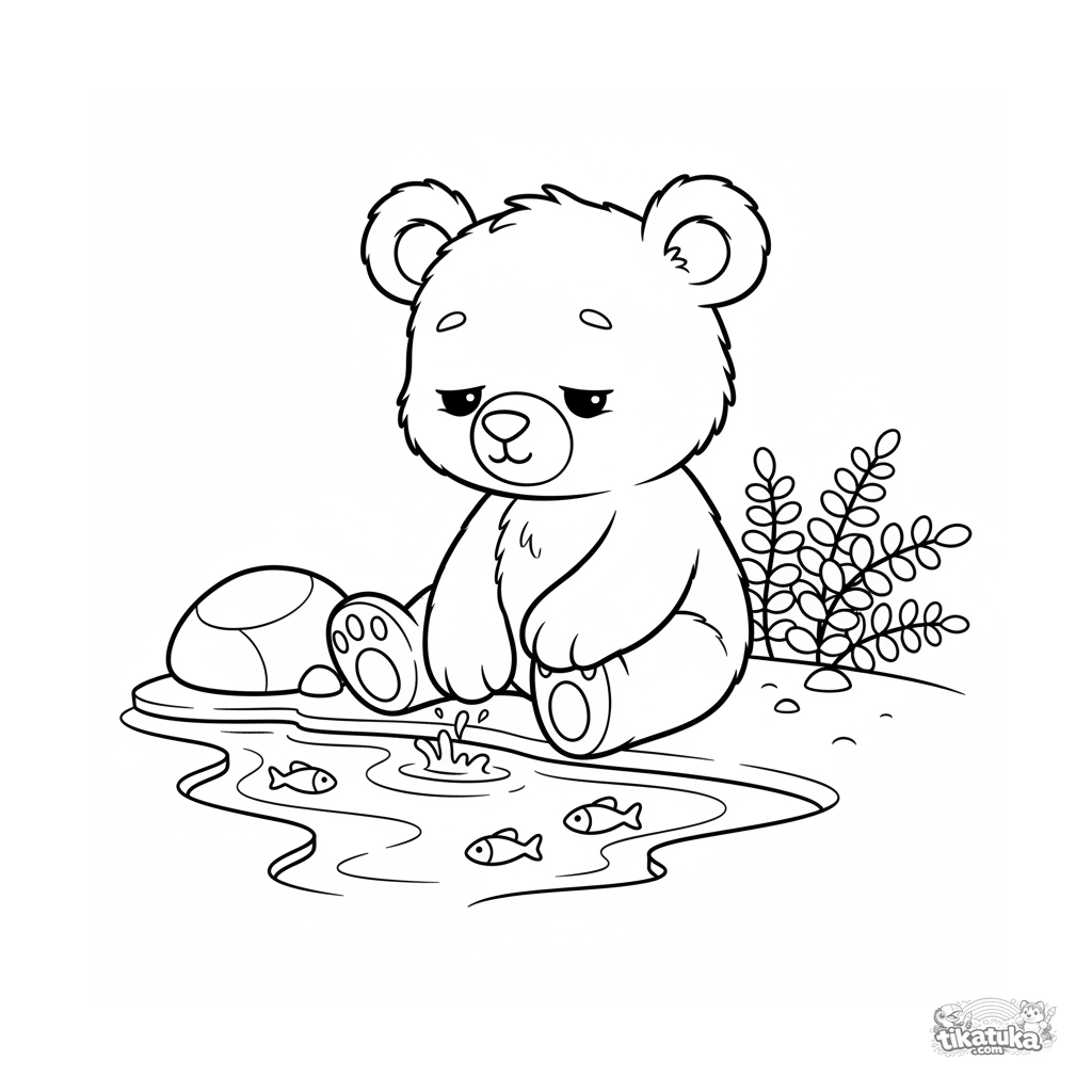 Einfaches Ausmalbild für Kleinkinder 2-3: ein flauschiges Bärenjunges sitzt am Bach und planscht mit der Pfote. Große, klare Formen.