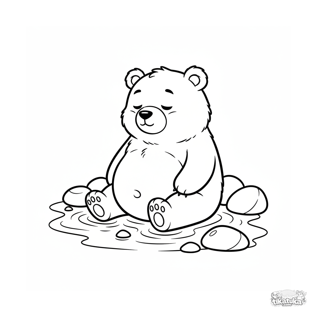 Einfaches Ausmalbild für Kleinkinder 2-3: ein großer Plüschbär sitzt in einem Bach und fischt. Große Formen, wenige Details.