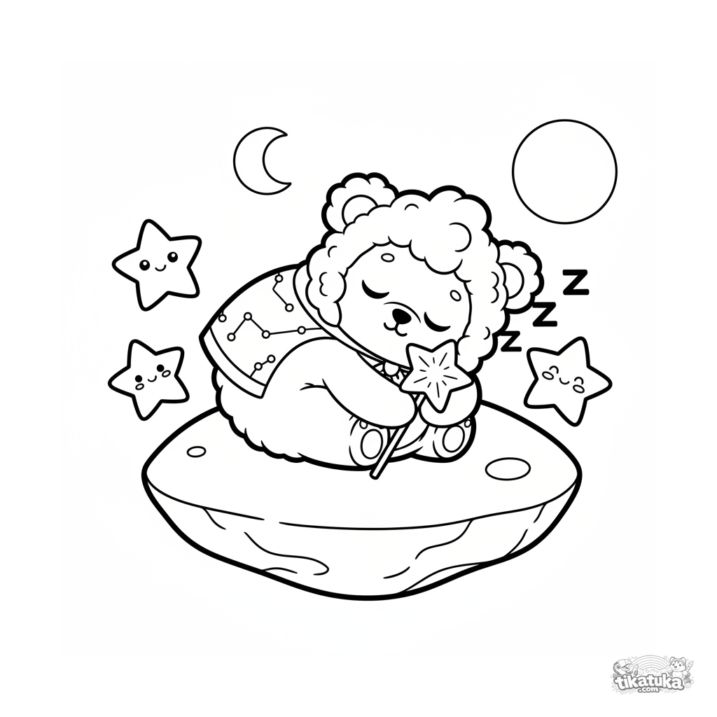 Einfaches Ausmalbild für Kleinkinder 2-3: Ein schläfriger Sternbild-Wächter aus Plüsch schläft auf einem schwebenden Felsen und hält einen Sternen-Nachtlicht.