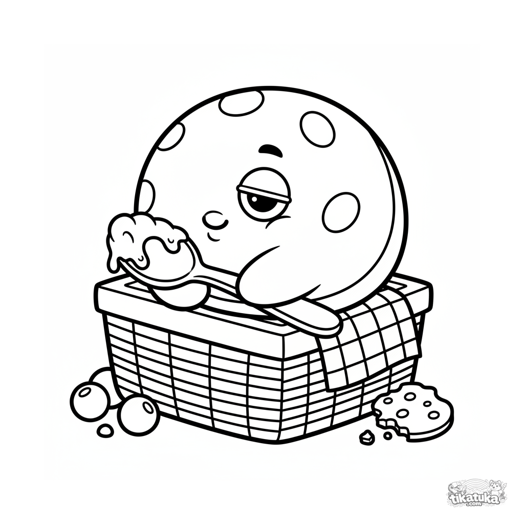 Sehr einfaches Ausmalbild für Kleinkinder 2-3: Ein schläfriges donutförmiges Monster nickert auf einem Picknickkorb. Große, geschlossene Formen.
