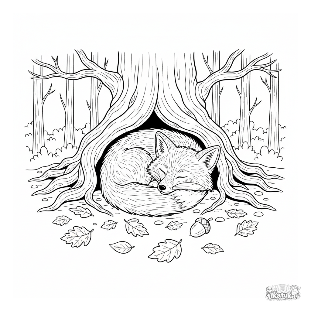 Ausmalbild für Kinder 4-6 Jahre: Ein Fuchsjunges schläft unter einer alten Eiche im Herbstwald. Mit fallenden Blättern und einer Eichel. Realistischer Stil, friedliche Szene.