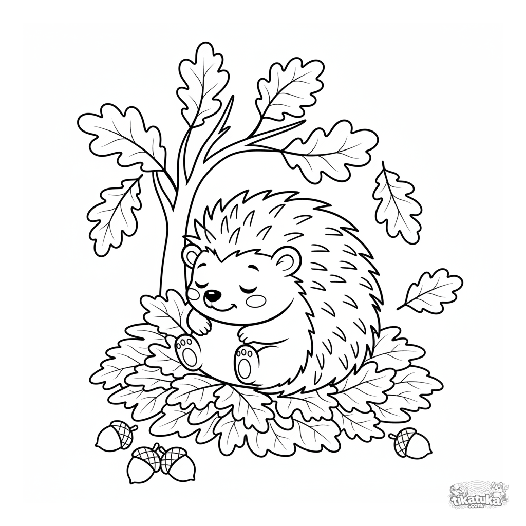 Ausmalbild eines schläfrigen Igels für Kinder von 4-6 Jahren. Der Igel schläft in einem Nest aus Herbstblättern unter einer Eiche.