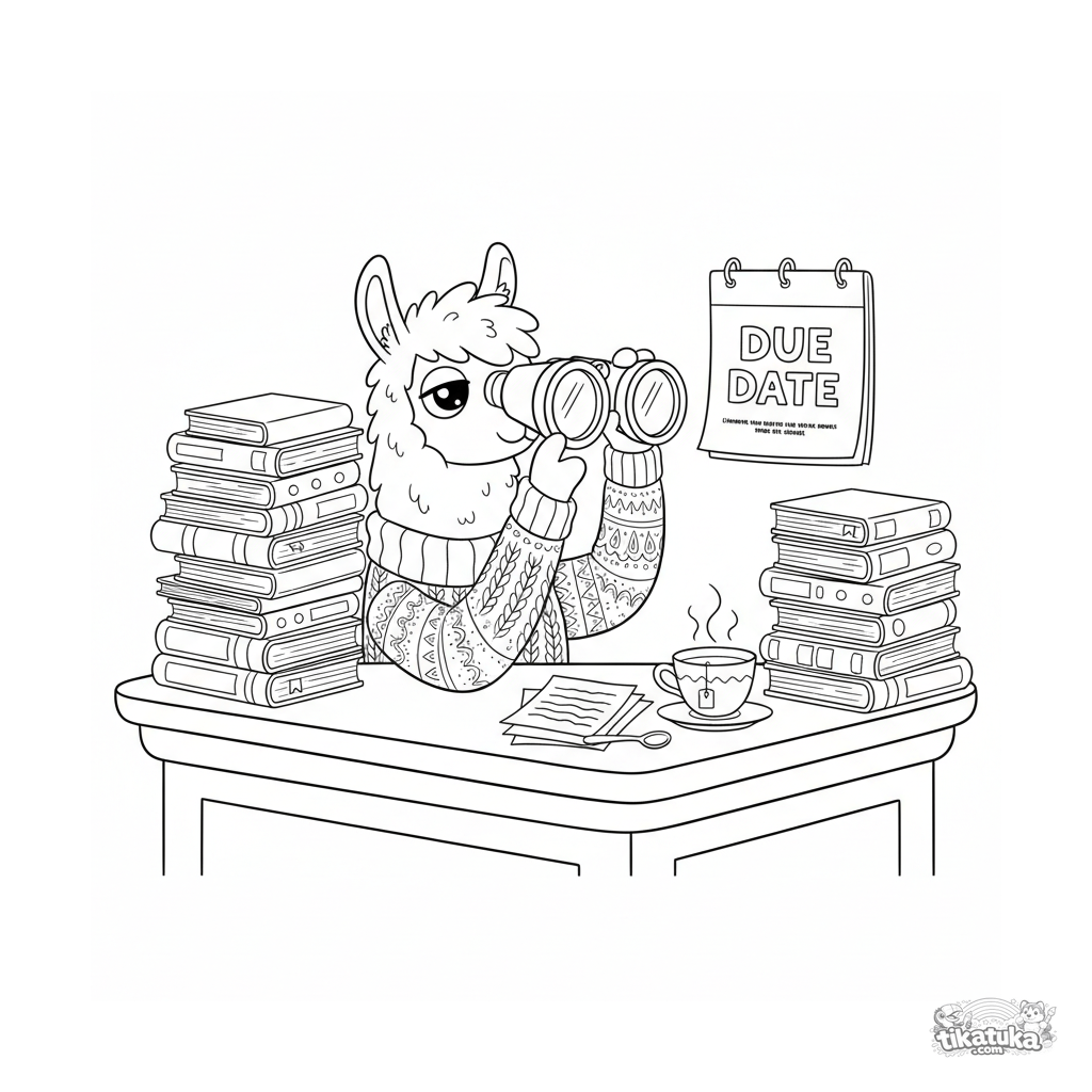 Ausmalbild für Kinder 10-12: Ein schläfriges Lama im Pullover benutzt ein Fernglas am Bibliothekstisch, um ein fernes Fälligkeitsdatum zu lesen. Weiche, humorvolle detaillierte Szene.