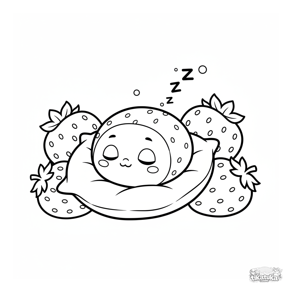 Einfaches Ausmalbild für Kleinkinder 2-3: Ein schläfriges Erdbeer-Mochi schläft auf einem Blattkissen. Große Formen, weite Ränder für erste Buntstifte.