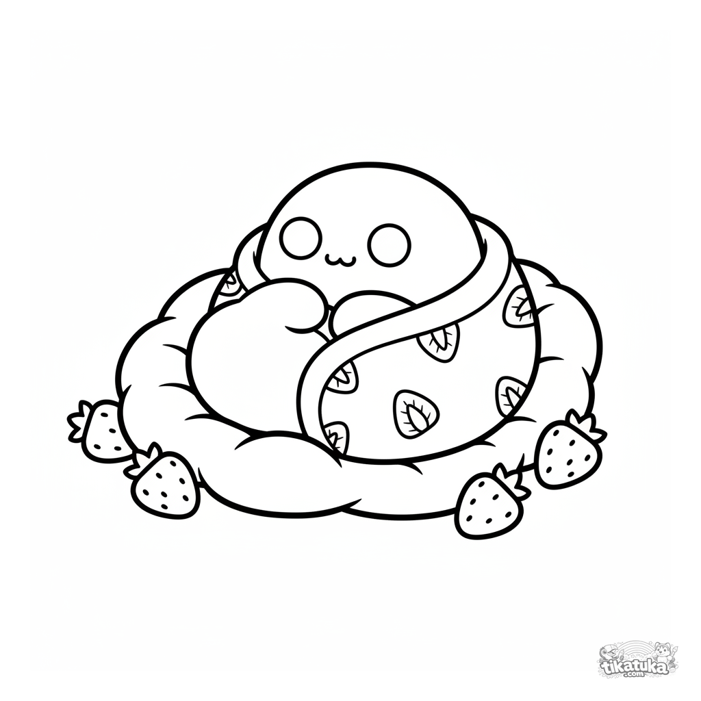 Ausmalbild für Kleinkinder: Ein schläfriger Mochi kuschelig in eine Erdbeerscheiben-Decke gewickelt auf einem flauschigen Kissen. Einfache, ruhige Szene.