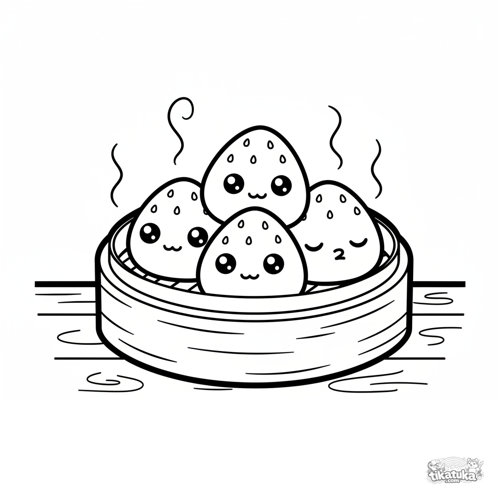 Ausmalbild für Kleinkinder: Ein gemütlicher Haufen schläfriger Mochi in einem Bambusdämpfer. Große, einfache Formen und eine ruhige Szene.