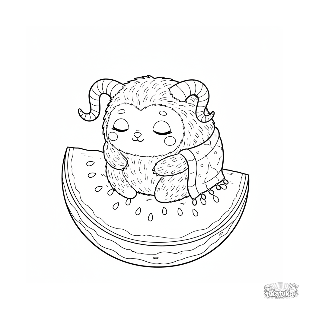 Detailliertes Ausmalbild im Naturführer-Stil: ein schläfriges Monster nickert auf einer Wassermelone auf einem Picknick.