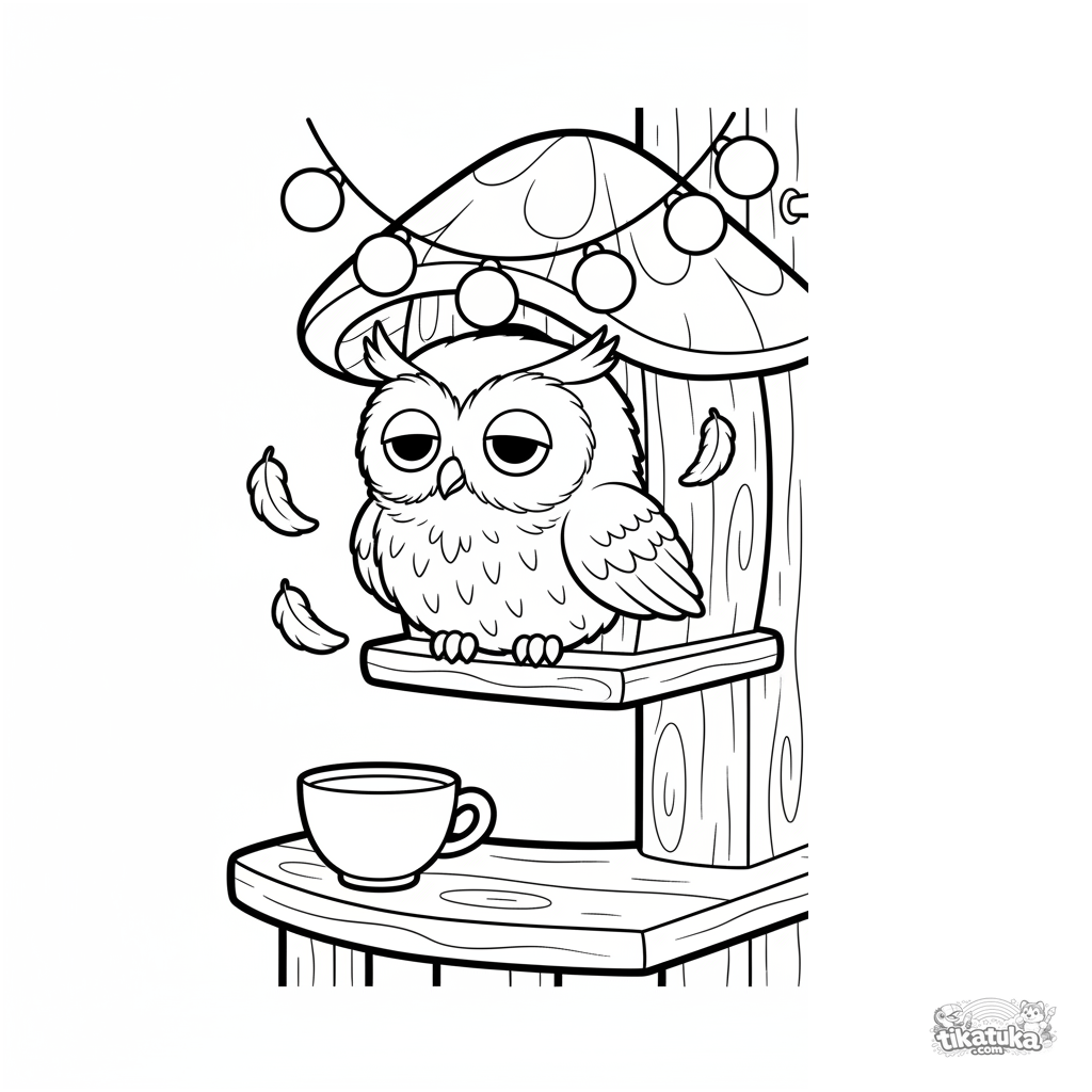 Ausmalbild für Kleinkinder: Eine schläfrige Eule lugt aus einem gemütlichen Nistkasten auf einer Veranda hervor. Sehr einfache Formen.