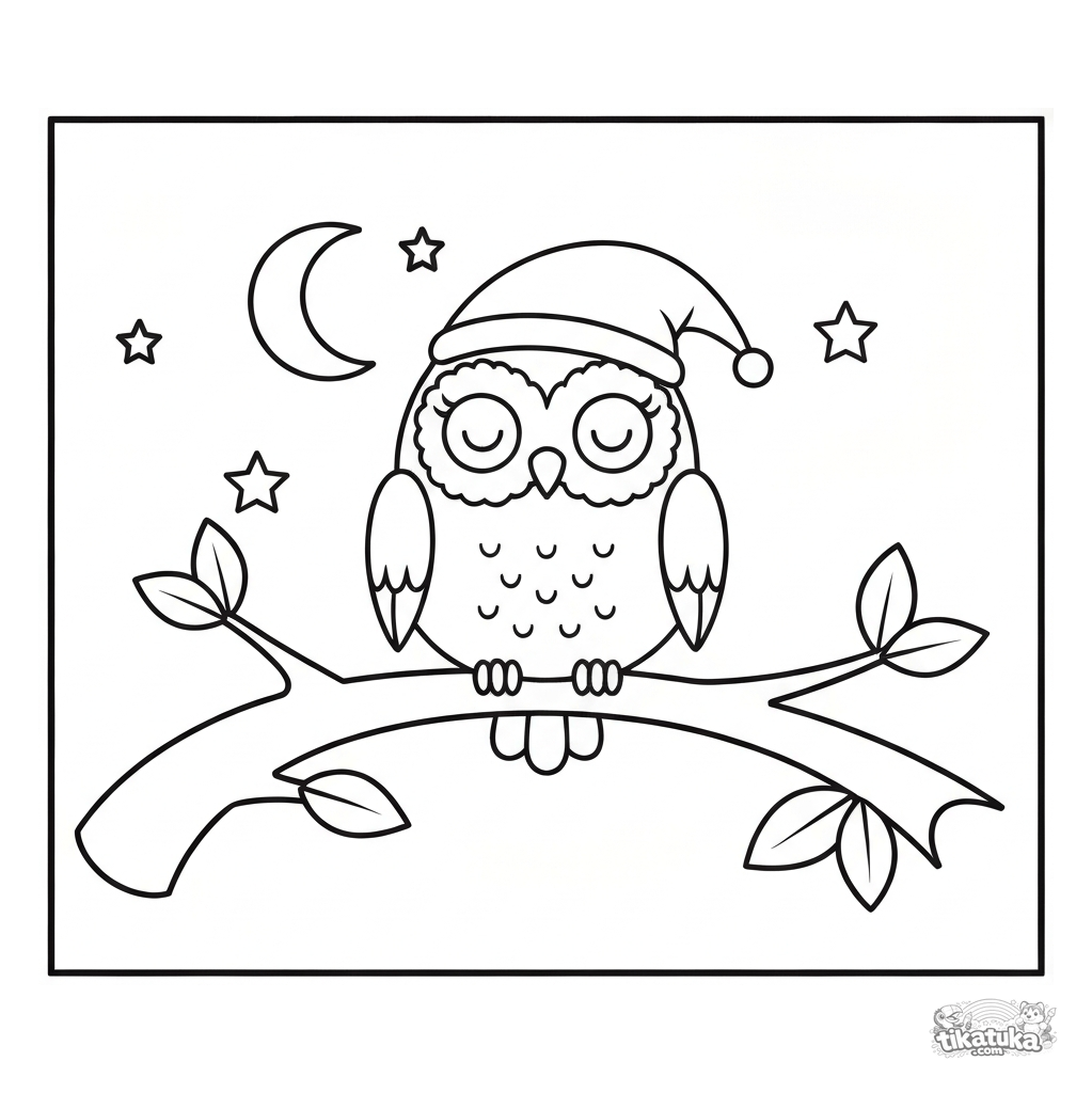 Ausmalbild für Kleinkinder: Eine schläfrige Eule mit Nachtmütze sitzt auf einem Ast unter dem Mond. Einfache Umrisse, für 2-4 Jahre.