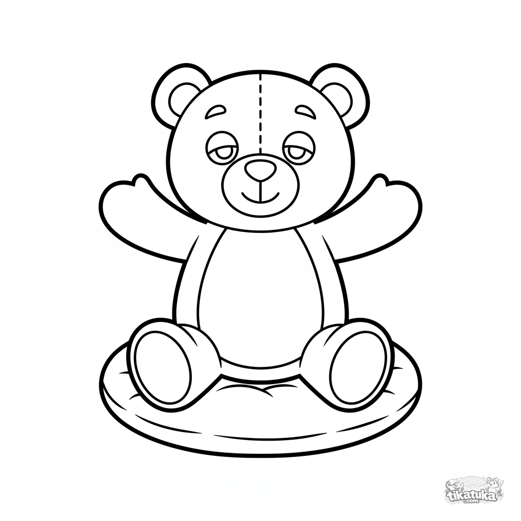 Ausmalbild für Kleinkinder: ein schläfriger Plüschbär sitzt auf einem weichen Kissen. Einfache große Formen, minimale Details, perfekt für 2-3 Jahre.